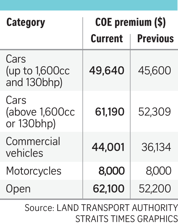 COE prices for cars up to 1,600cc and 130bhp closed 8.9 per cent higher to hit a four-year high of $49,640. COE for cars above 1,600cc or 130bhp shot up by 17 per cent to finish at $61,190 - its highest since September 2015.