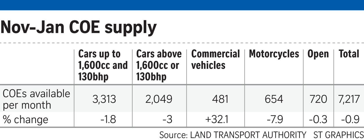 The Land Transport Authority (LTA) said yesterday that there will be 7,217 COEs up for grabs each month during the period, or 0.9 per cent fewer than the number during the current period. Car and motorcycle buyers will have to contend with fewer certificates, while businesses will have more, for commercial vehicles, with the quota growing 32.1 per cent to 481 a month.