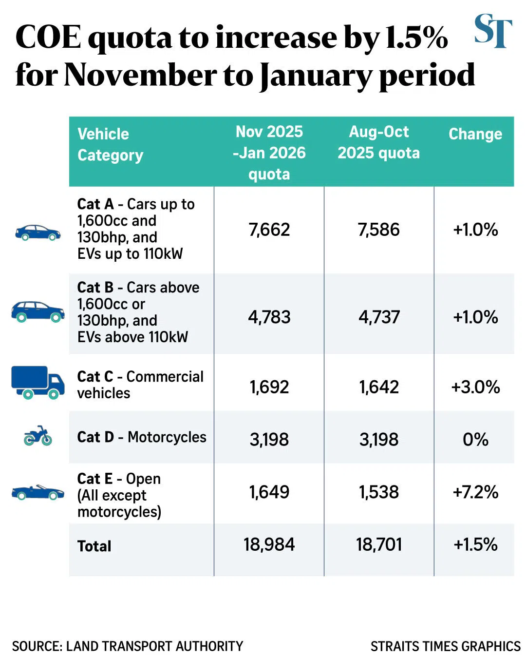 - COE supply will increase by 1.5% to 18,984 for November-January, with Category A rising 1% and Category B rising 1% (LTA announcement).