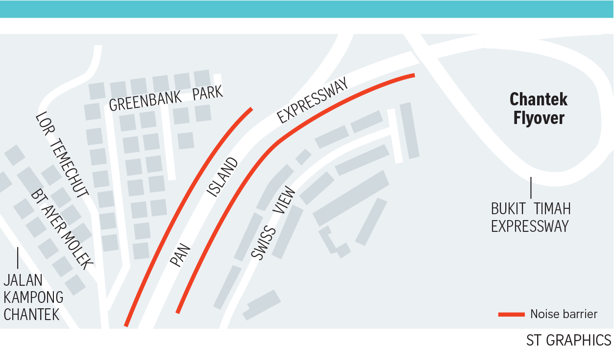 The 6m-high barriers will run for about 400m along the edge in each direction of the Pan Island Expressway (PIE) next to Swiss View and Greenbank Park.