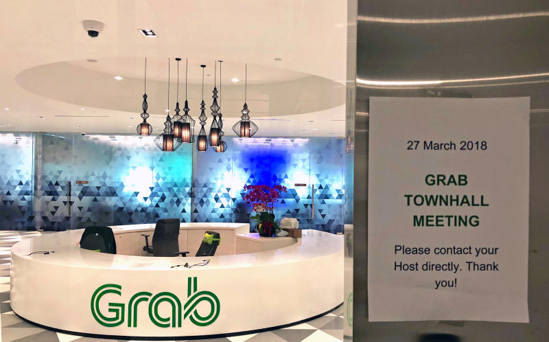 A notice announcing a townhall meeting is seen outside the Grab office at Marina One West Tower on March 27, 2018.