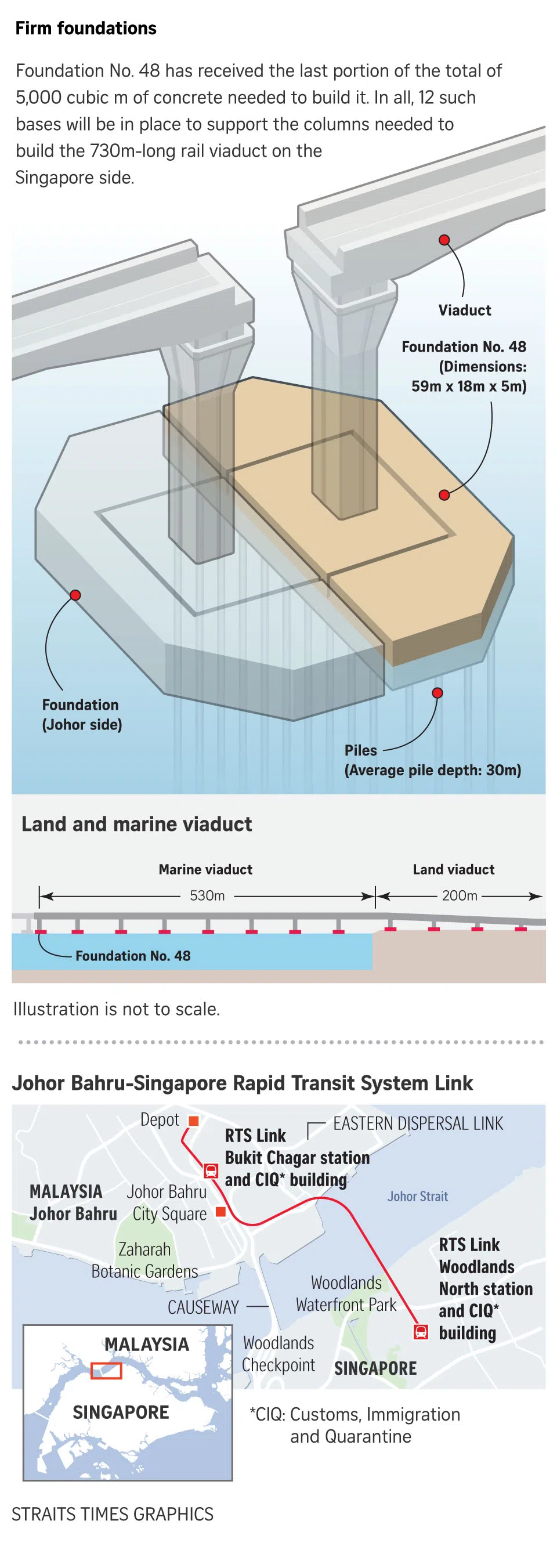 Done in three stages, 5,000 cubic m of concrete – enough to fill 2½ Olympic-size swimming pools – are needed to build just one of the 12 foundations to be used for the 730m-long rail viaduct on the Singapore side of the RTS Link.