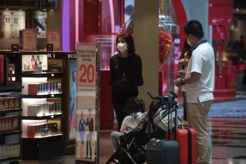 Visitors wearing masks as they shop at the duty-free stores in the transit area at Changi Airport Terminal 3 on Feb 14, 2020.