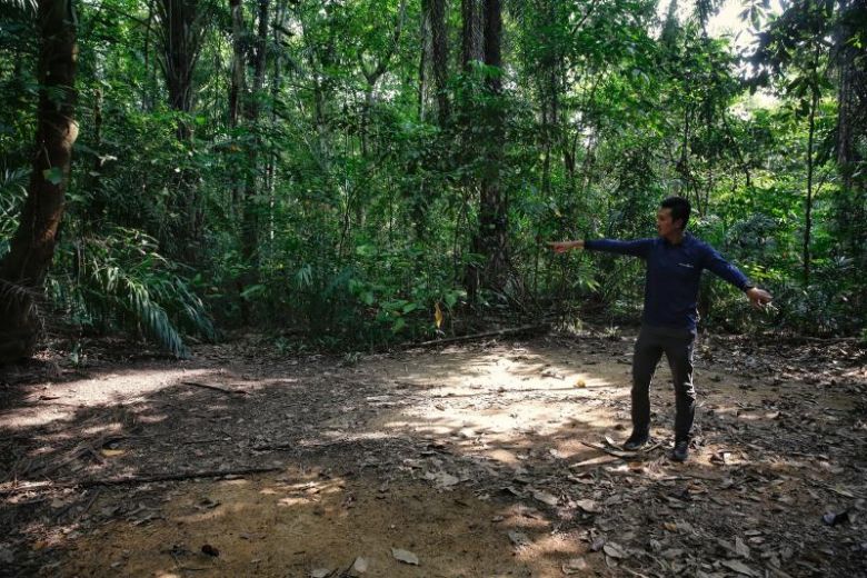 A photo taken on June 7, 2018, in which an LTA engineer shows the approximate location of a borehole during a site visit to the Central Catchment Nature Reserve after completion of investigation works for the Cross Island Line train tunnel.