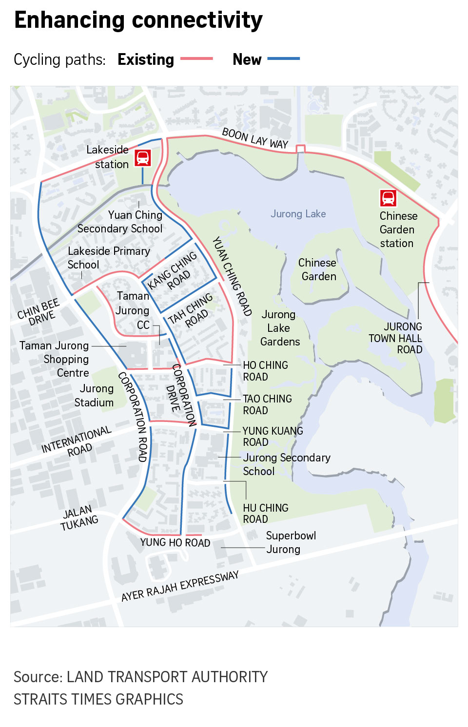 SINGAPORE - Taman Jurong residents can now use a 5.6km-long cycling path that connects Lakeside and Chinese Garden MRT stations to get to schools, parks and markets in the area.