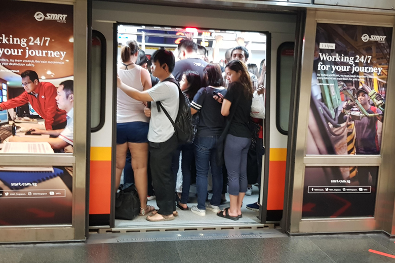 A crowded train at Braddell MRT station at around 10.30am on Dec 31, 2018. Service on the North-South MRT line was affected by a track fault during the morning peak.