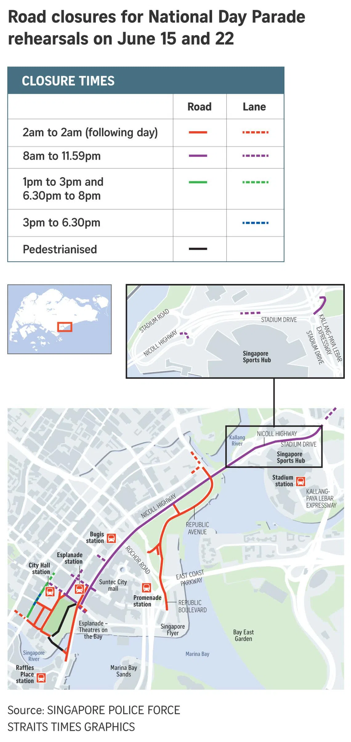 SINGAPORE - Dozens of roads and lanes will be closed to vehicles on June 15 and 22 due to National Day Parade rehearsals that will take place on both these Saturdays at the Padang.