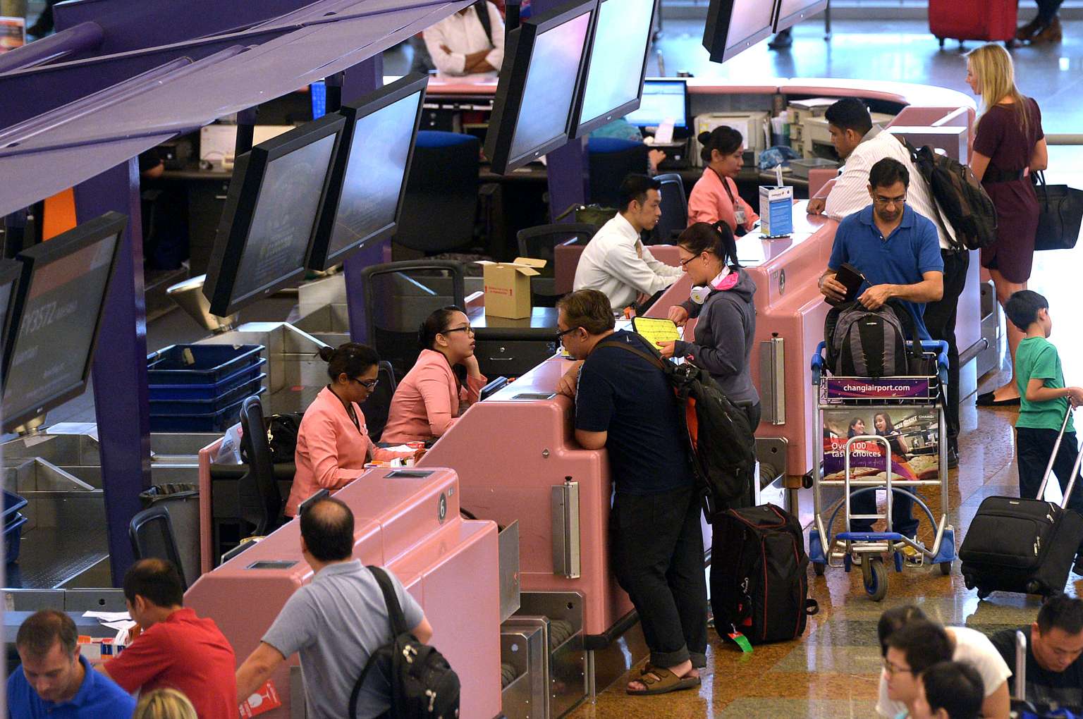 Travellers at a check-in counter in Changi Airport Terminal 2.