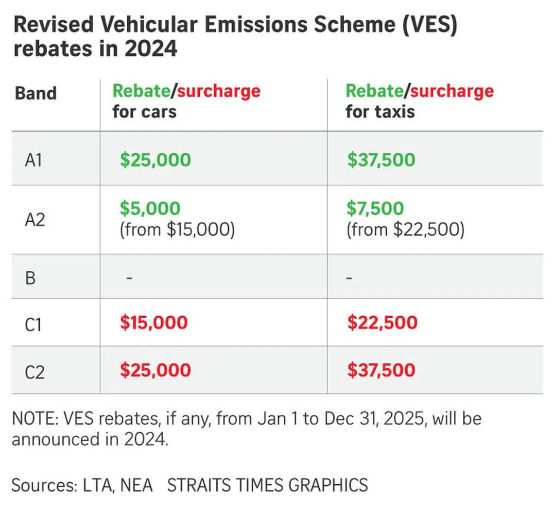 Meanwhile, the maximum rebate of $25,000 under the National Environment Agency’s (NEA) Vehicular Emissions Scheme (VES), which covers cars with zero exhaust pipe emissions such as EVs in Band A1, will stay unchanged from January to December 2024.