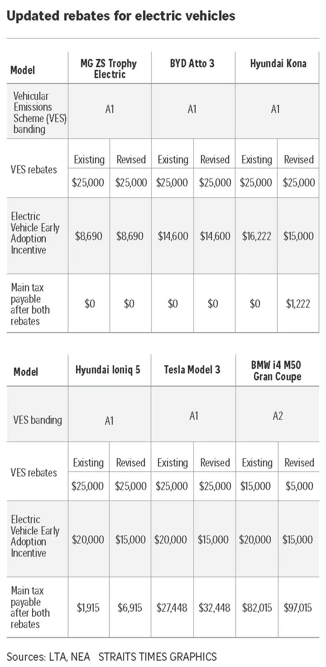 LTA and NEA said most mass-market electric car models would get the same level of rebates as they do today.