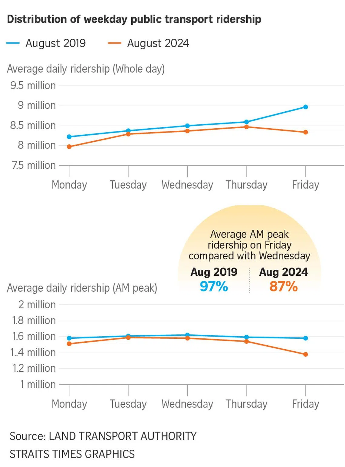 Her observations are backed by public transport ridership figures for January to August 2024, which show a daily average of around 8.1 million bus and train journeys made from Tuesday to Thursday – 1.5 per cent higher than the 7.98 million journeys on Monday and Friday.