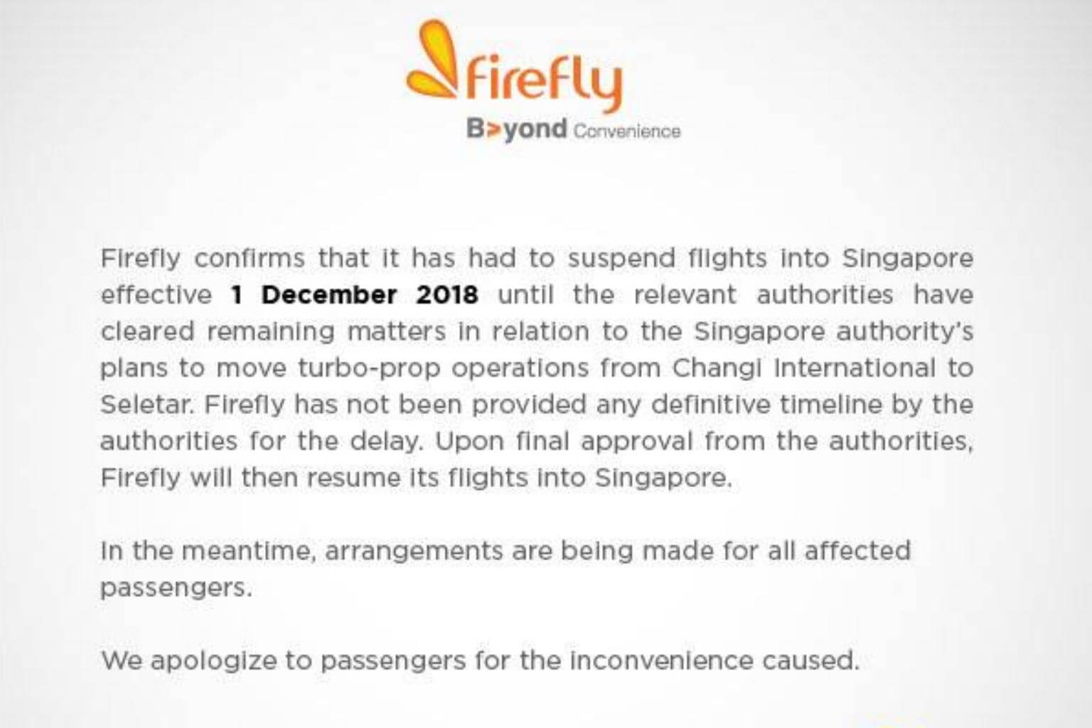 The airline said in its notice: "Firefly confirms it has had to suspend flights into Singapore effective Dec 1, 2018 until the relevant authorities have cleared remaining matters in relation to the Singapore authority's plans to move turboprop operations from Changi ... to Seletar."