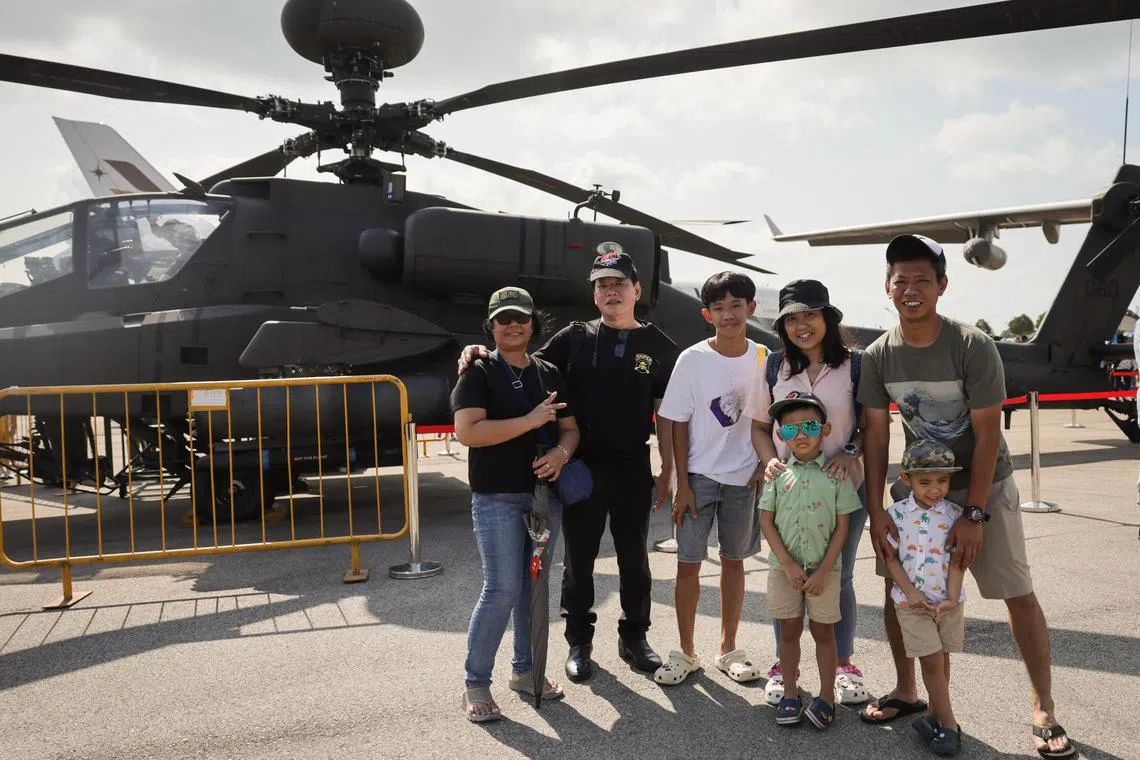 Mr Yew Mui Meng (second from left) with his family in front of an AH-64D Apache helicopter on display by Republic of Singapore Air Force during the Singapore Airshow on Feb 24.