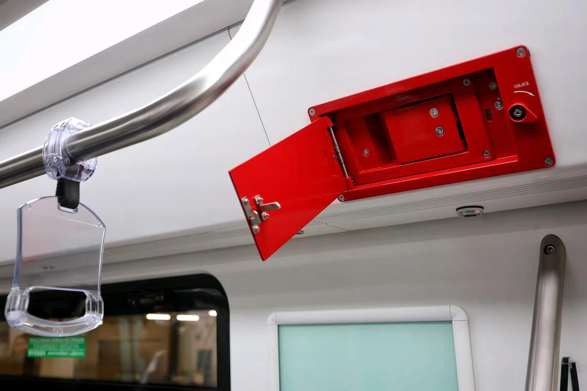They can also evacuate by opening one of several red hatches with a lever to open the train doors. Opening the hatch will send an alarm to the operations control centre, and the lever can be used only when the train comes to a standstill.