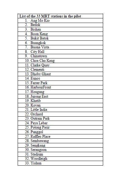 It is now available at 33 MRT stations under the pilot, with the latest five stations - Buangkok, Kovan, Little India, Paya Lebar and Potong Pasir - being equipped with the service from Monday.