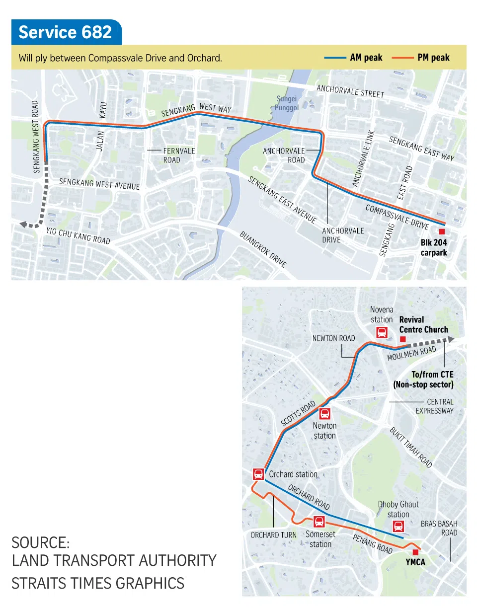 Service 682 ferries passengers between Compassvale and Dhoby Ghaut via the CTE. It will serve bus stops on Compassvale Drive, Anchorvale Drive, Sengkang East Way, Sengkang West Way, Moulmein Road and Orchard Road.