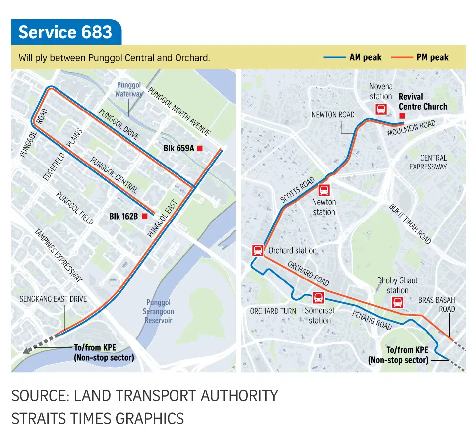 Service 683 will take passengers from Punggol Central to Orchard and Novena via the KPE. It will run along Punggol Central, Punggol Road, Punggol East, Sengkang East Drive, Orchard Road, Scotts Road and Newton Road.