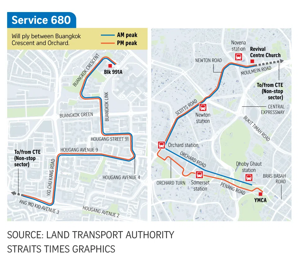 Service 680 will take passengers from Buangkok to Orchard and Dhoby Ghaut via the CTE. It will serve bus stops along Buangkok Crescent, Hougang Avenue 9, Ang Mo Kio Avenue 3 and Orchard Road.