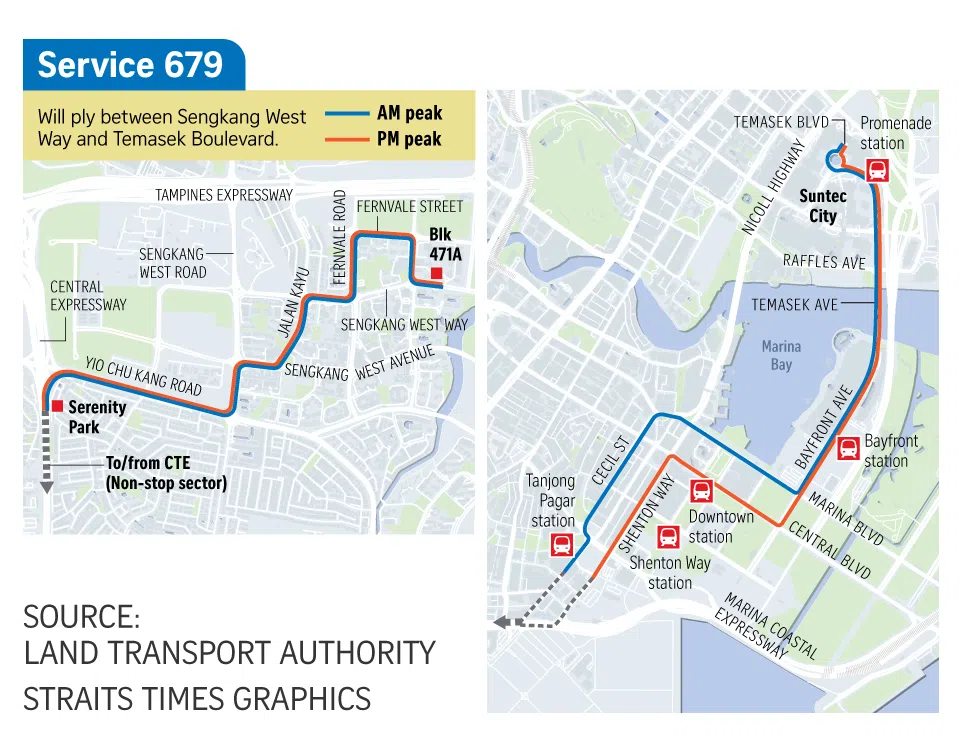 Service 679 will run between Sengkang West, the Downtown area and Suntec City via the Central Expressway (CTE). Its route includes Sengkang West Way, Fernvale Street, Jalan Kayu, Yio Chu Kang Road and Bayfront Avenue.