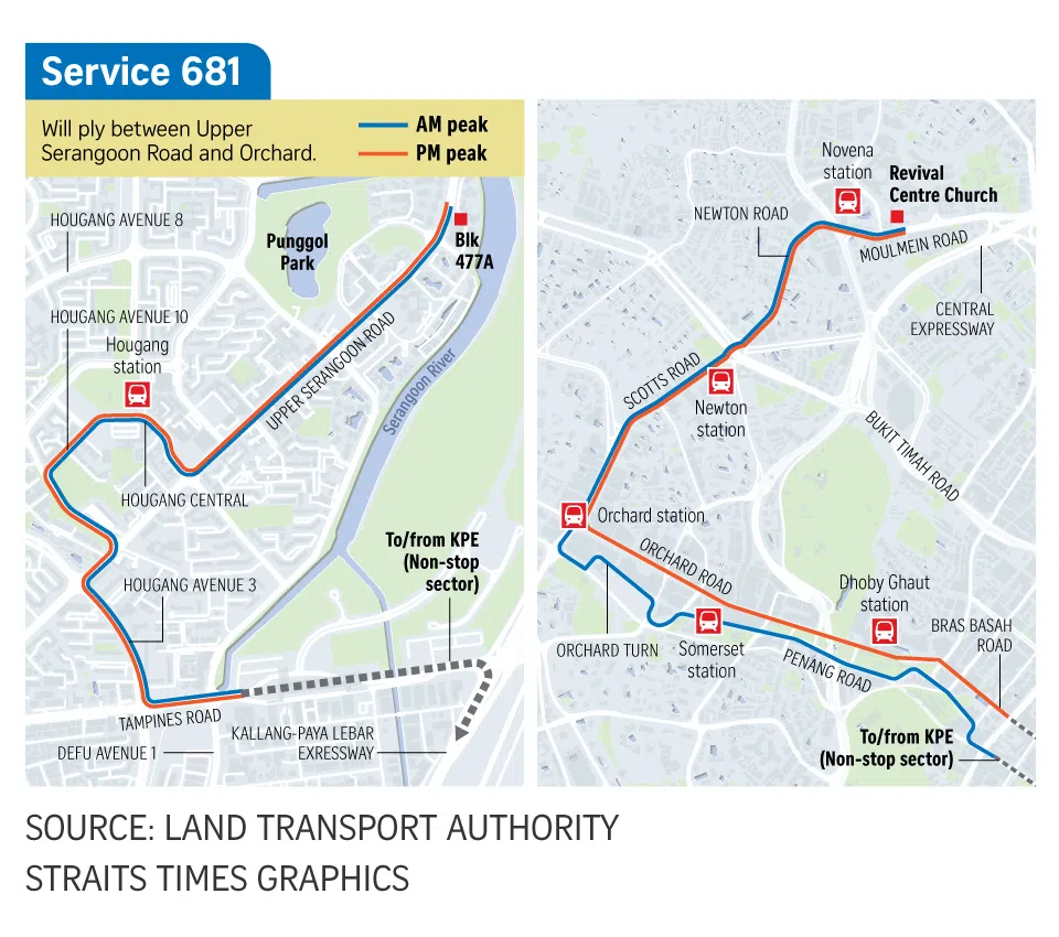 Those living in Upper Serangoon will also have the new bus service 681. This will ferry passengers from Upper Serangoon to Orchard and Novena via the Kallang-Paya Lebar Expressway (KPE), serving stops along Upper Serangoon Road, Hougang Central, Tampines Road, Orchard Road, Scotts Road and Moulmein Road.
