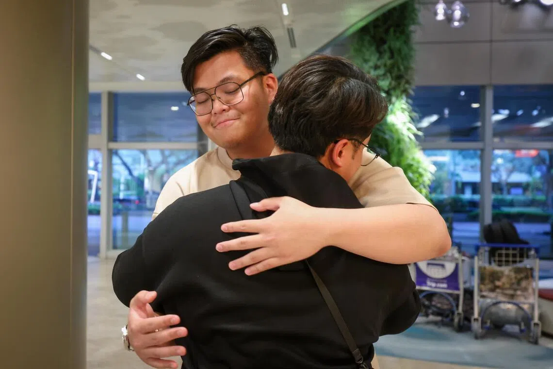 Mr Solihin Zainal embracing his father, Mr Zainal Osman, upon returning from Jeddah at Changi Airport on March 13. The 20-year-old said he heard “sirens all day” and “saw explosions from afar” in Jordan.