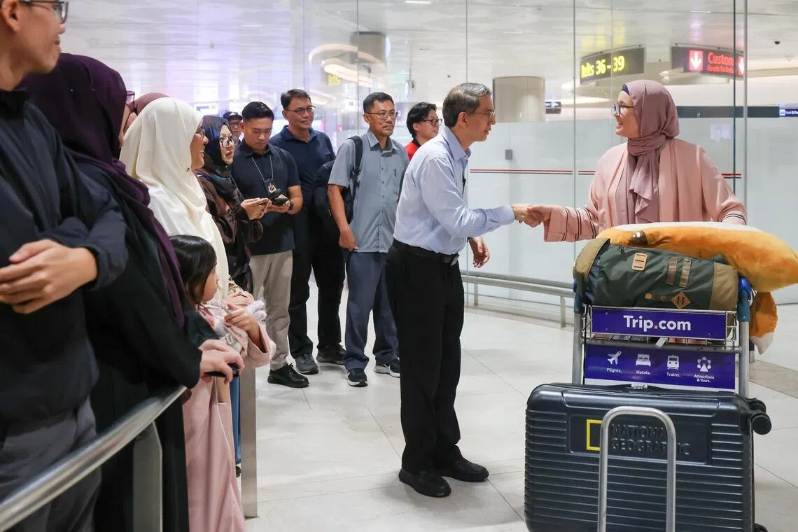 Acting Minister-in-charge of Muslim Affairs Faishal Ibrahim greeting returnees from Jeddah as they arrived at Changi Airport on March 13.