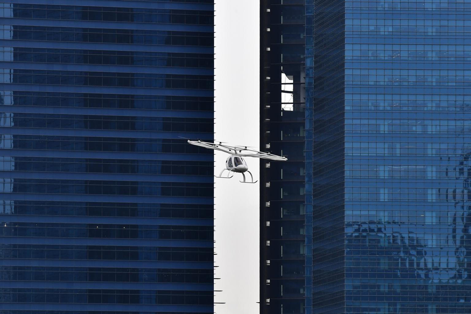 Volocopter's emission-free aircraft takes off and lands vertically. Each autonomous electric drone can carry up to two passengers.