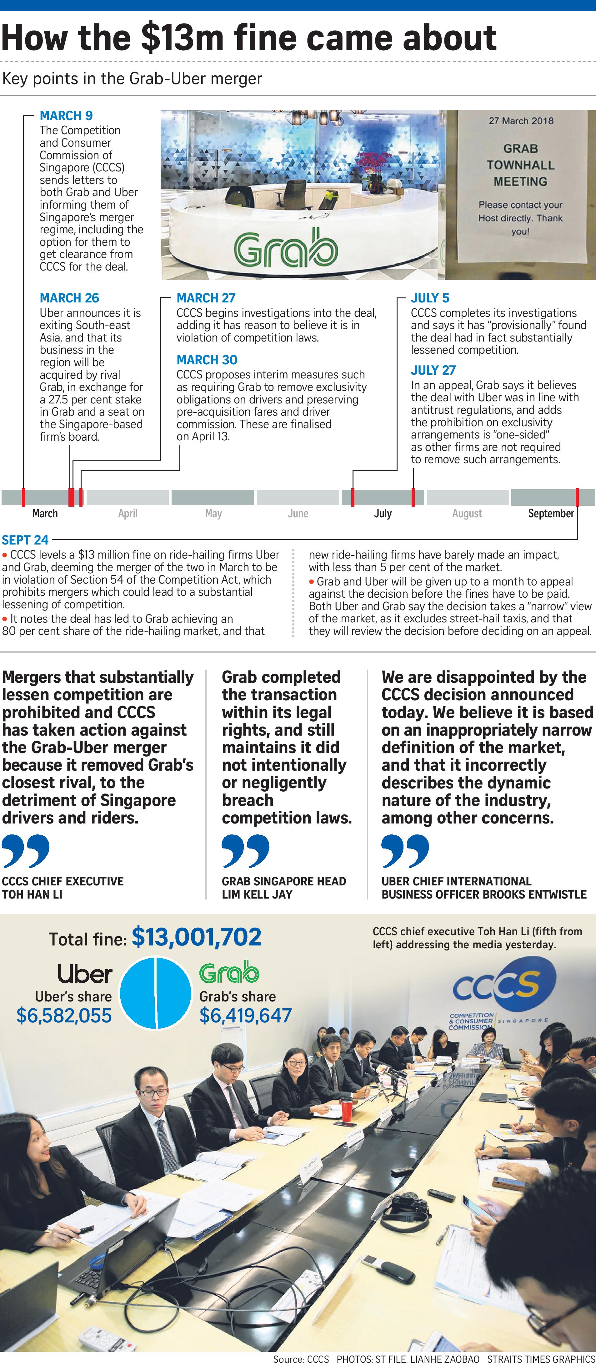 Grab and Uber completed their union on March 26, in spite of the CCCS sending both parties a letter on March 9 explaining Singapore's merger notification regime and CCCS' corresponding powers to investigate and penalise anti-competitive mergers.