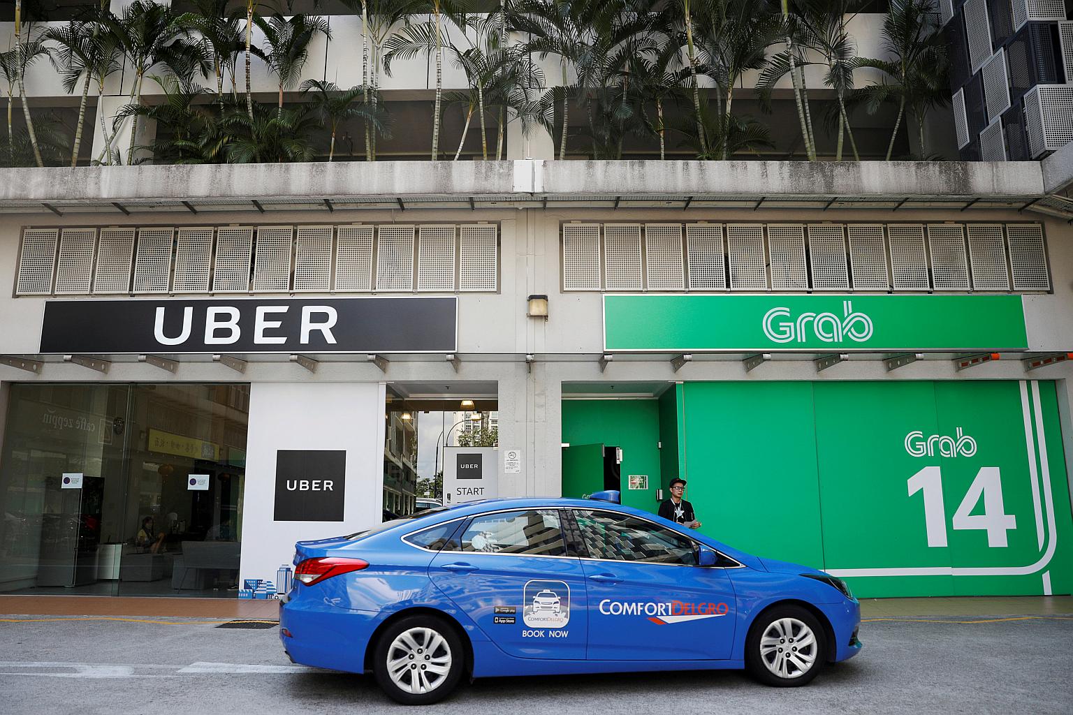A ComfortDelgro taxi passes Uber and Grab offices in Singapore on March 26, 2018.