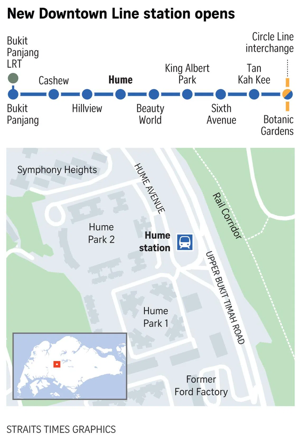 Hume station will have two entrances, one facing Upper Bukit Timah Road and the other facing Hume Avenue, Ms Low wrote on Facebook.