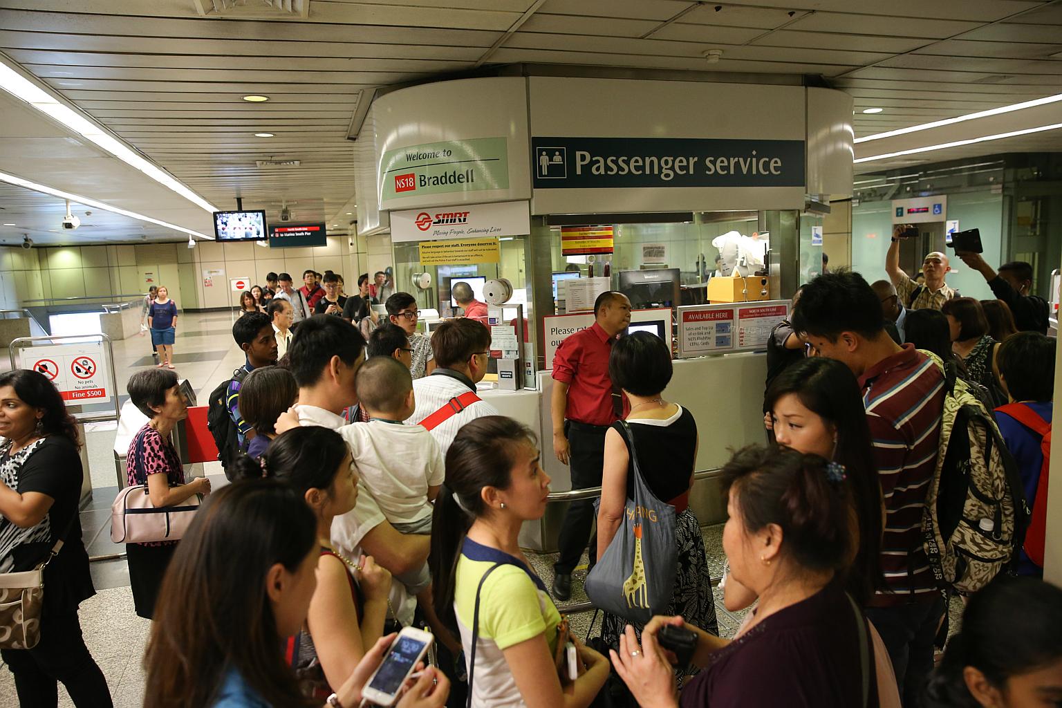 SMRT staff talking to commuters at Braddell MRT station.