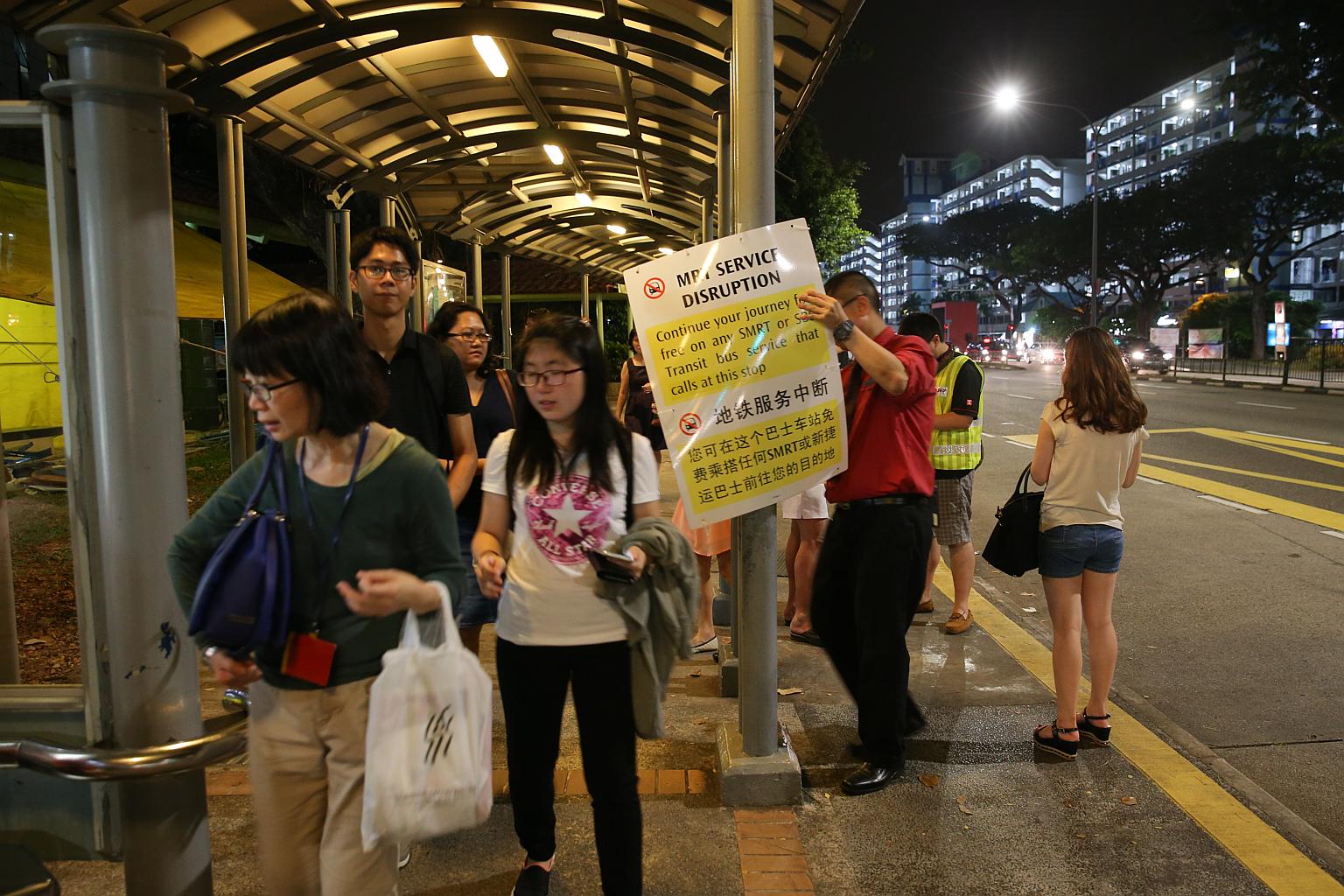 SMRT staff putting up a train disruption sign at the bus stop outside Braddell MRT station.