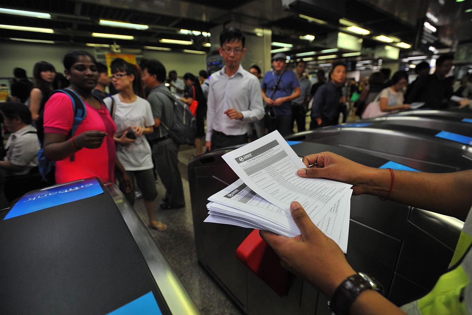 Staff handing out leaflets at City Hall MRT station during the MRT breakdown on July 7, 2015.