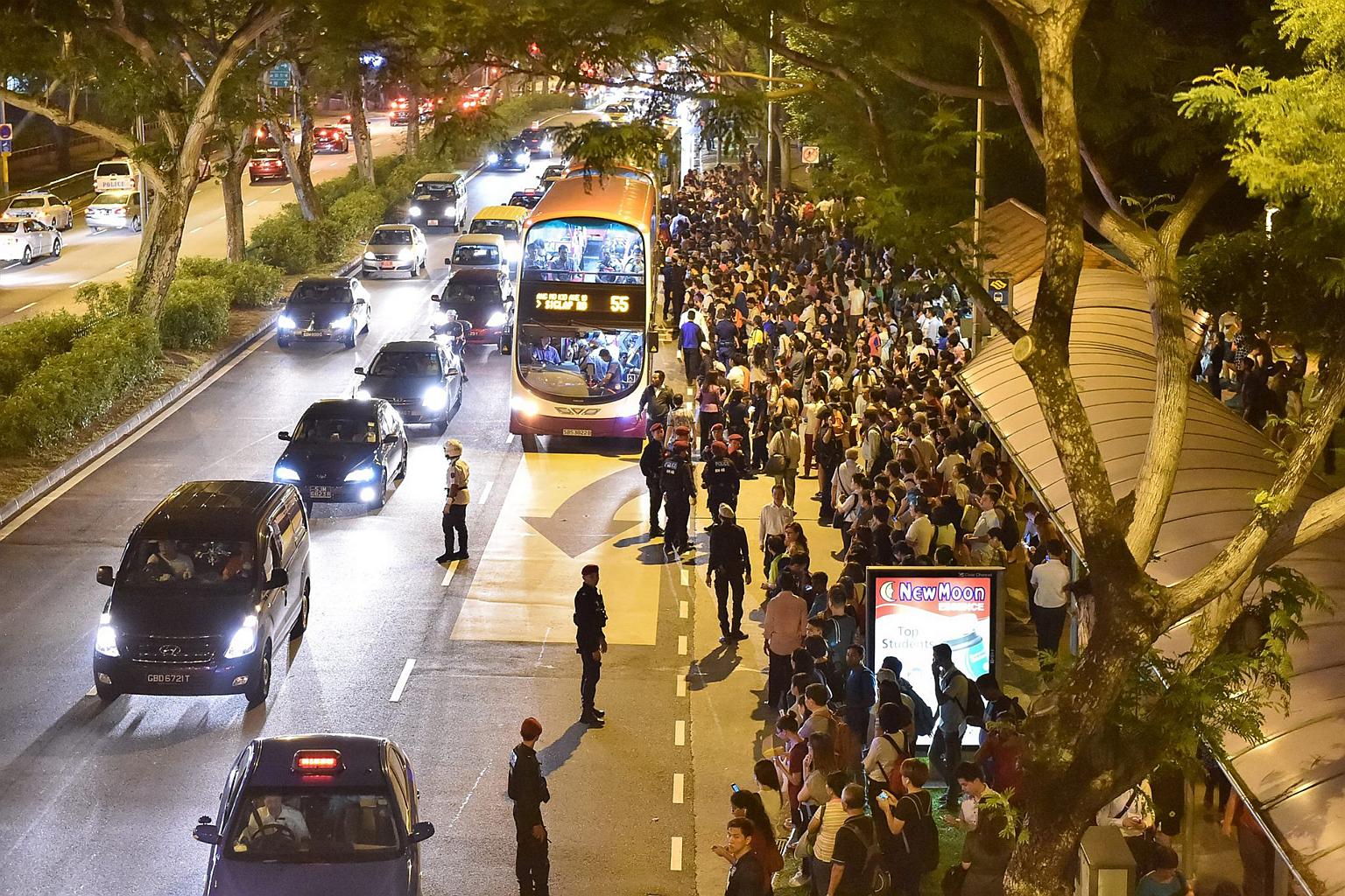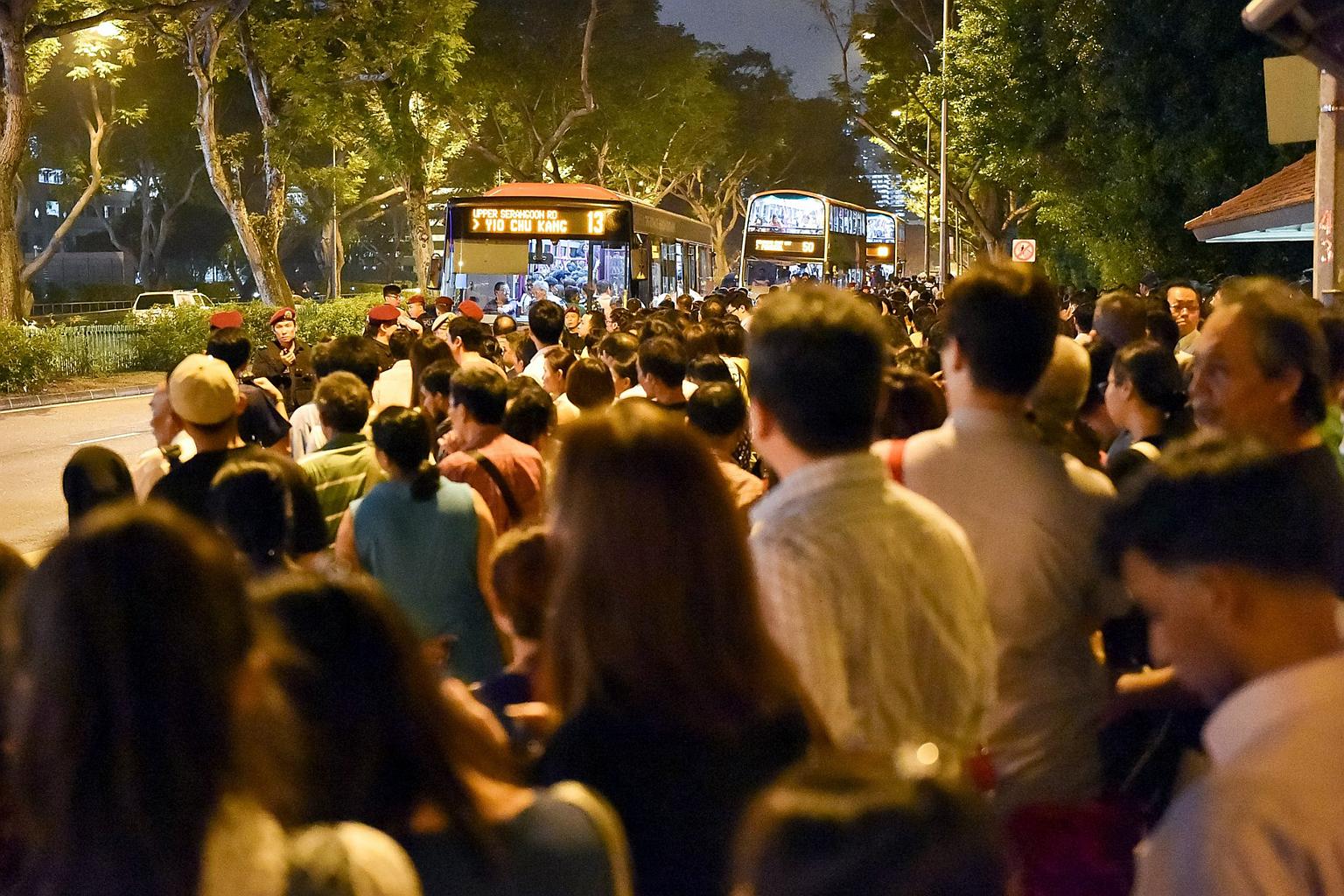 Crowds of people waiting for buses near Bishan MRT station during the MRT breakdown.