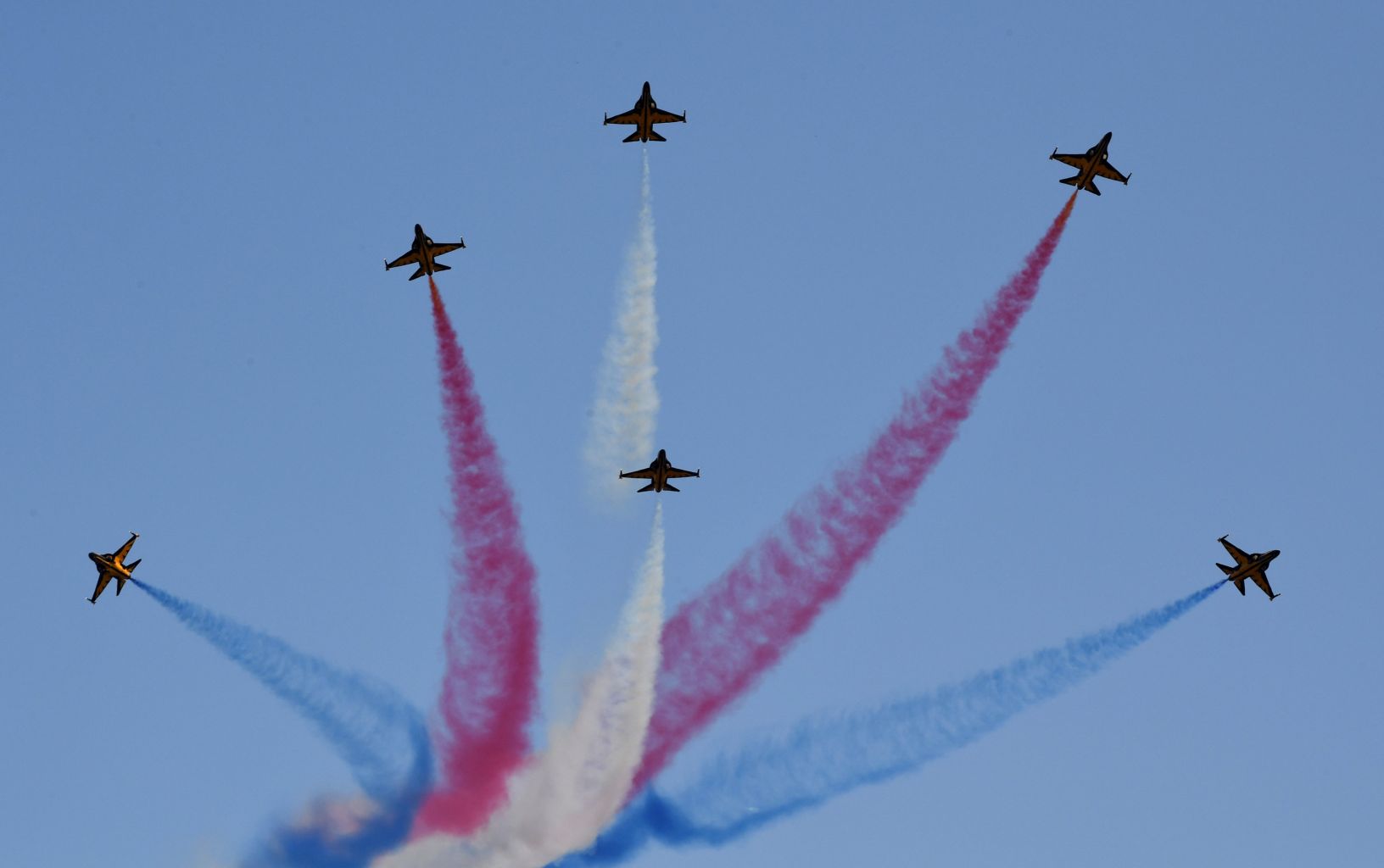 The Korean Black Eagles perform during a commemoration ceremony marking South Korea's Armed Forces Day in Pyeongtaek on Sept 28, 2017.