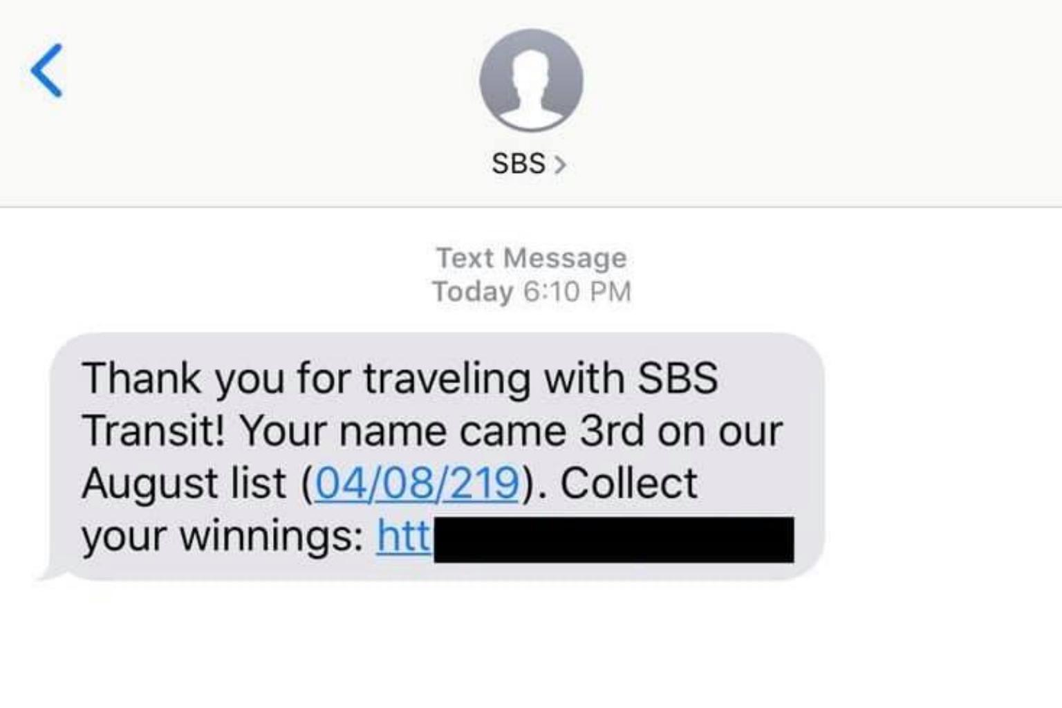 The ComfortDelGro-owned bus and train operator said in a Facebook post on Tuesday (Aug 6): "We've been alerted that passengers have received a SMS/Whatsapp claiming that they have won a prize from SBS Transit and to collect their winnings via a link.