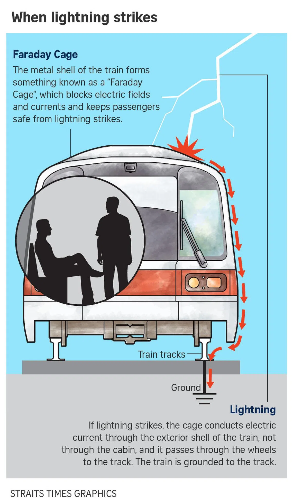 SMRT said then that travelling in trains during lightning storms is safe because trains are protected by a Faraday cage. A Faraday cage, or the metal shell of a train, is an enclosure made of a conductive metal that blocks electric fields and currents, such as lightning strikes, from entering a train.