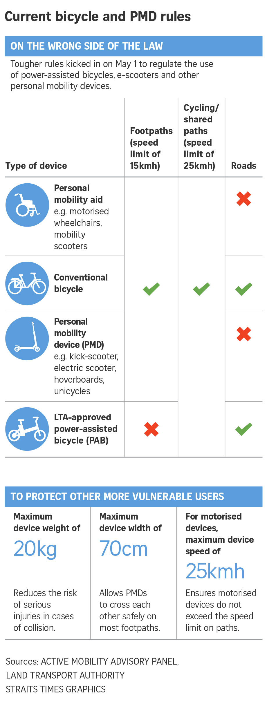 As for helmets, the panel wants wearing them to be mandatory for those using devices when travelling on the roads. "In practice, this will only apply to cyclists on roads, as PMDs are not allowed on the roads under the Road Traffic Act," the panel said.