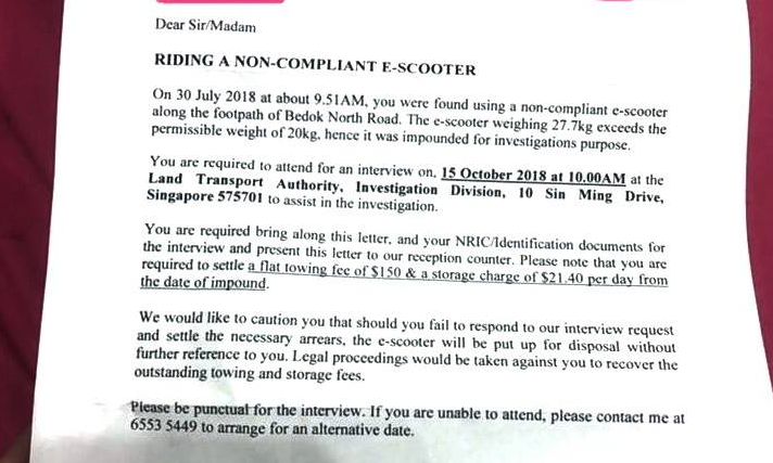 According to the letter, the woman was caught using the non-compliant 27.7kg e-scooter on the footpath of Bedok North Road at about 9.50am on July 30.