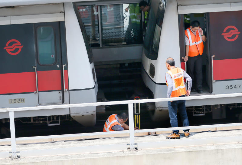 SMRT officials examining the two trains which had collided on Nov 15, 2017.