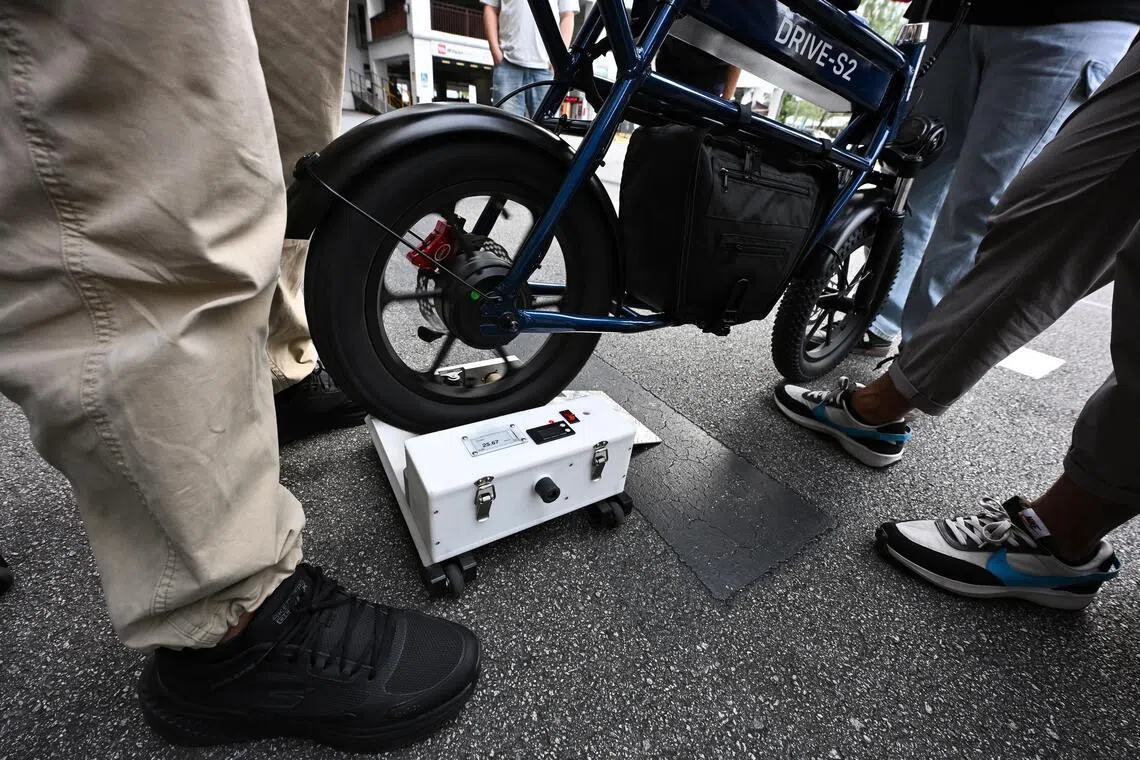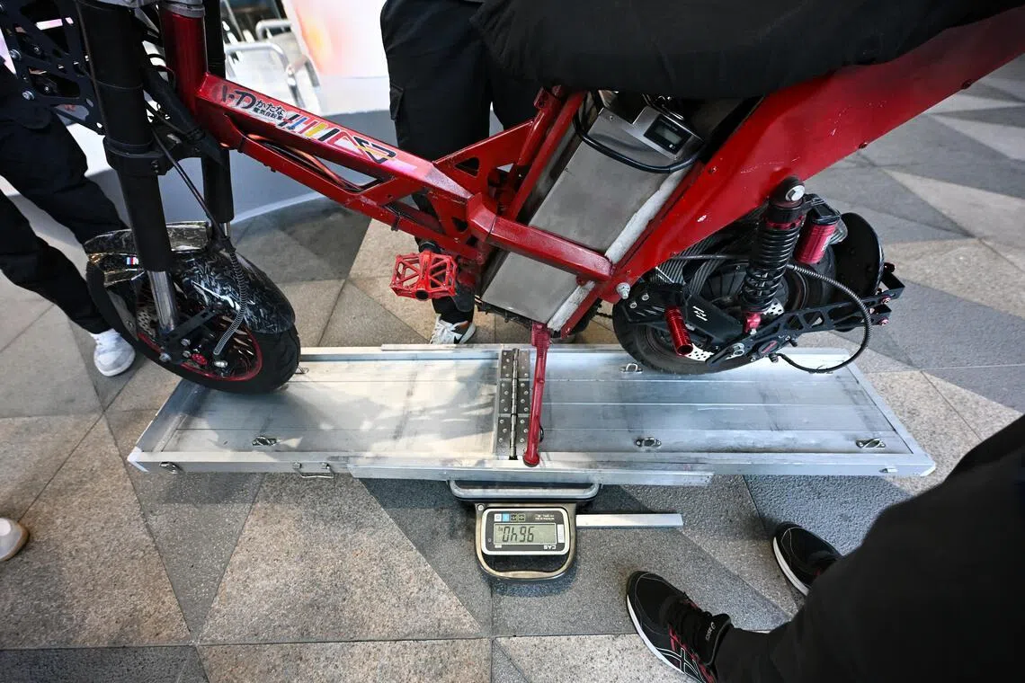 LTA enforcement officers weighing a power-assisted bicycle during an enforcement operation in Admiralty on Feb 23. The e-bike was found to be 96.4kg, over the allowed maximum of 20kg.