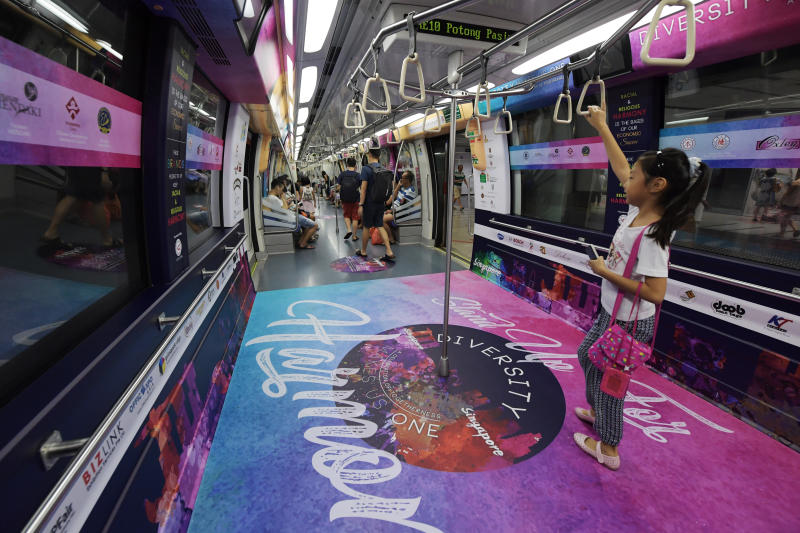 Passengers aboard the harmony-concept train on its way toward Punggol from Harbourfront on June 26, 2017.