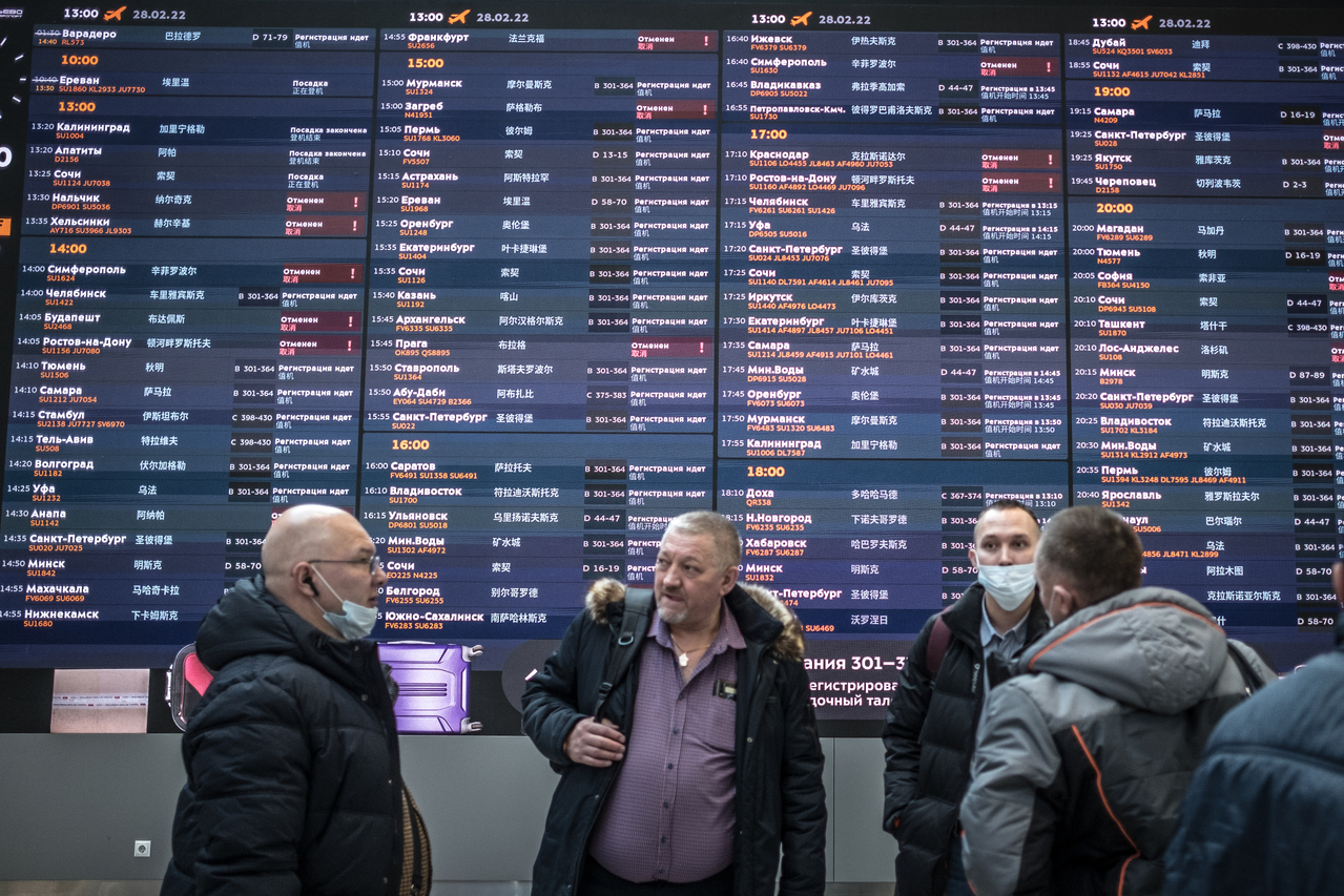 <p>Passengers in front of a departures board with some cancellations at Sheremetyevo International Airport in Moscow, Feb. 28, 2022. The ruble cratered, the stock market froze and the public rushed to withdraw cash on Monday as Western sanctions kicked in and Russia awoke to uncertainty and fear over the rapidly spreading repercussions of President Vladimir PutinÕs invasion of Ukraine. (Sergey Ponomarev/The New York Times)</p>