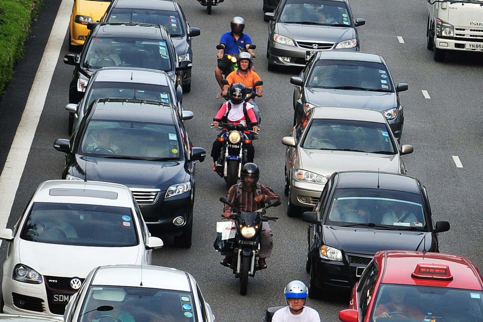 Motorcyclists weaving through heavy traffic on the Pan-Island Expressway (PIE) during the evening rush hour.