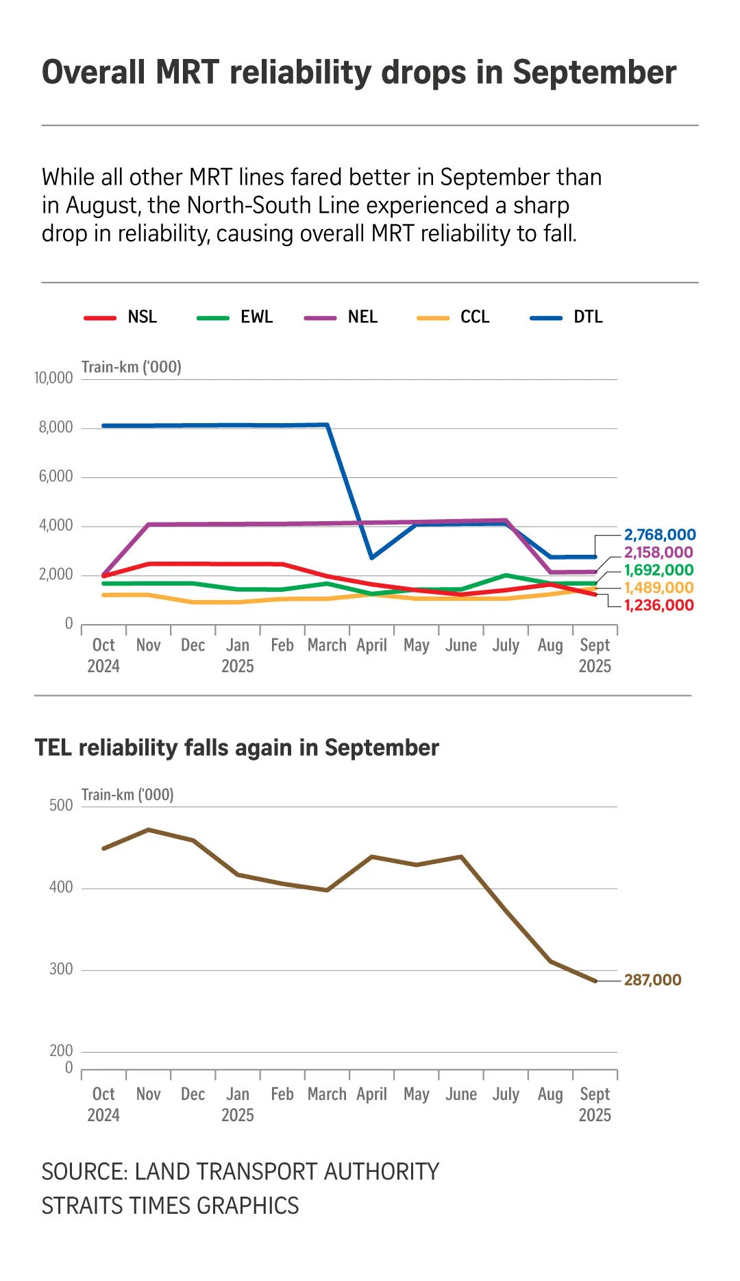 Reliability figures for TEL showed that the newest rail line posted 287,000 train-km between delays as at September, down from 311,000 train-km in August.