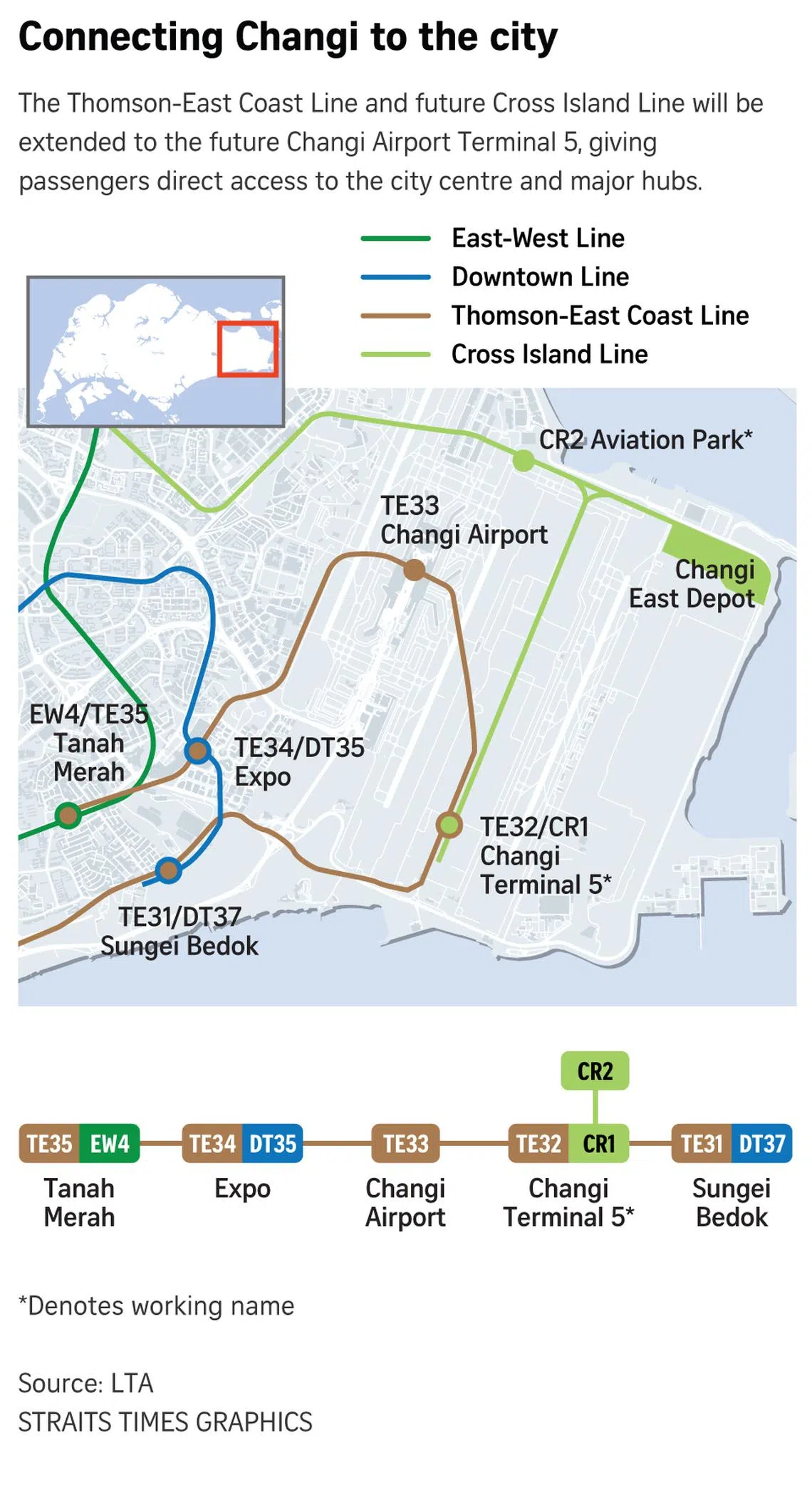 - The stations are being converted to Thomson-East Coast Line stations, creating a direct MRT link from the airport to the city via the future Terminal 5.