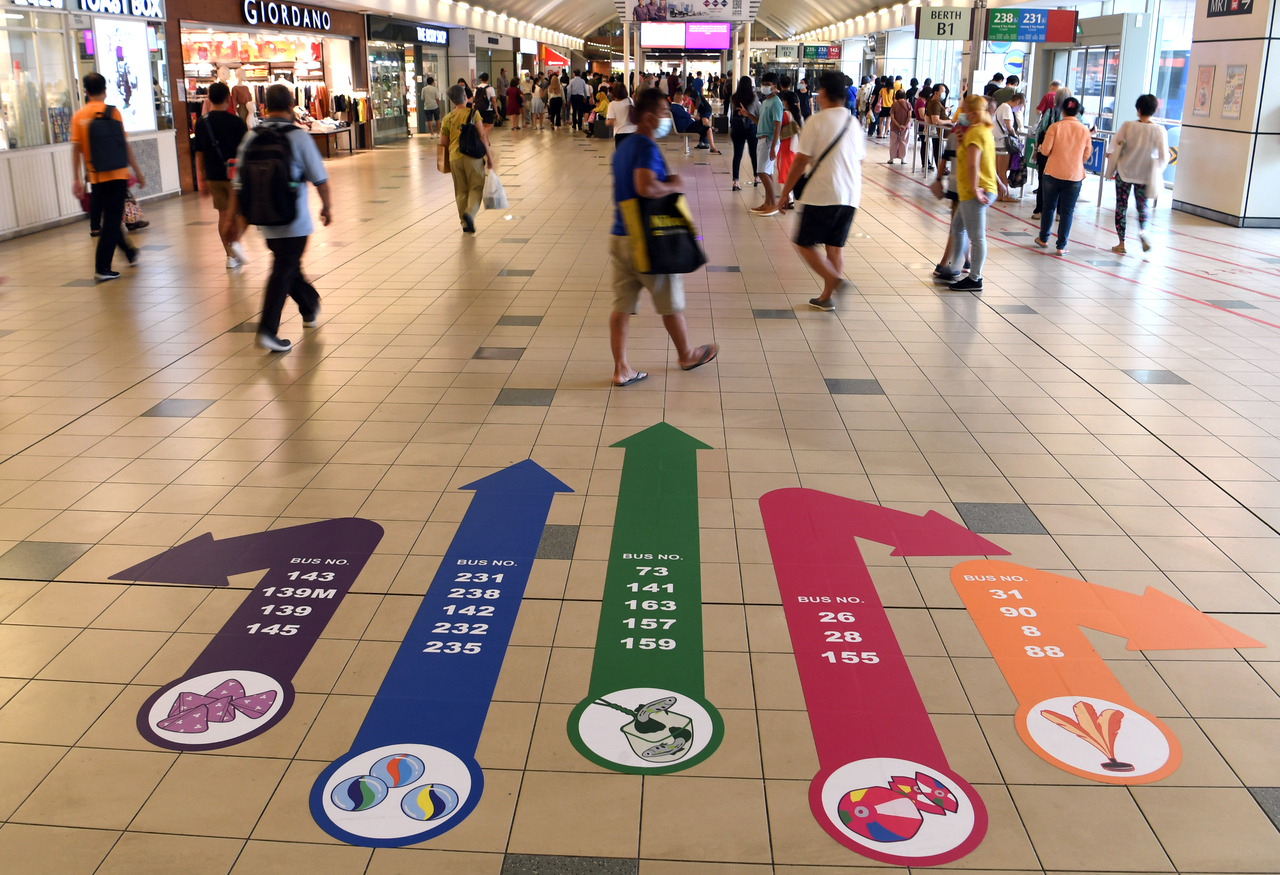 Images of five stones, capteh, paper balls, marbles and "longkang", or drain fishing, on the walls, along with colour-coded floor stickers, show people where to board the various buses.