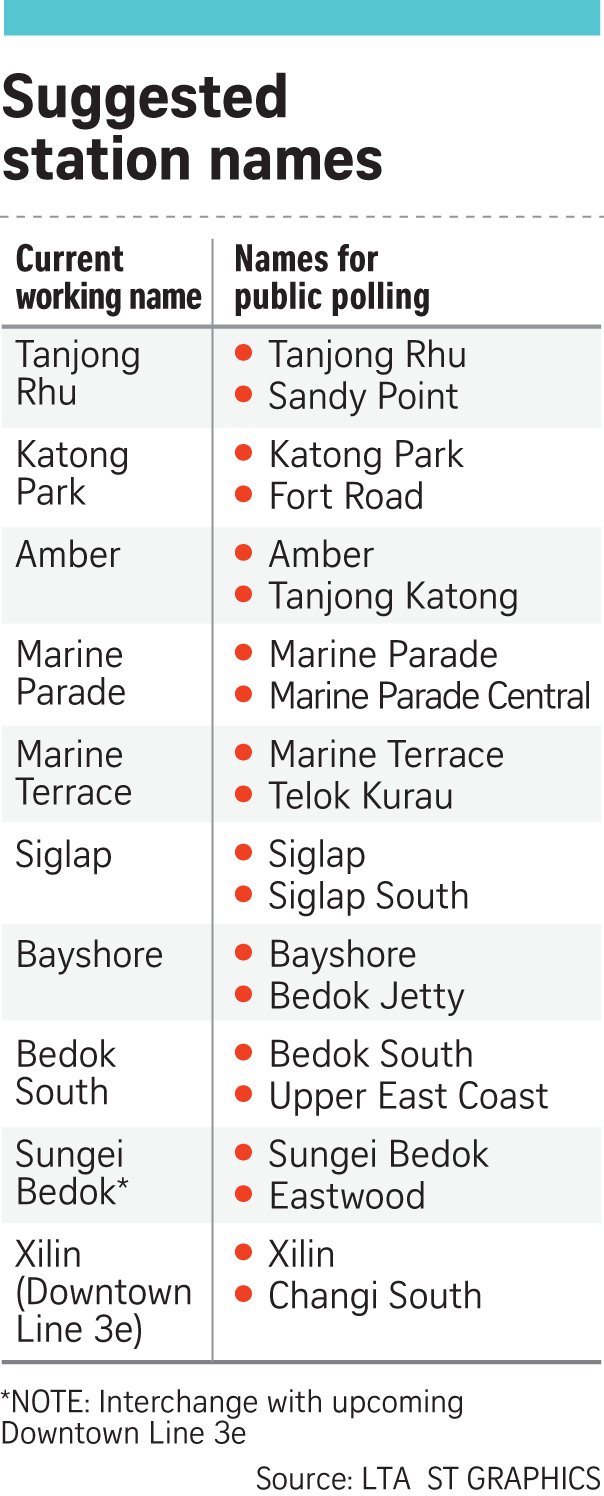 Among the names up for polling are Bayshore, Bedok Jetty, Amber, Tanjong Katong, Xilin and Changi South.