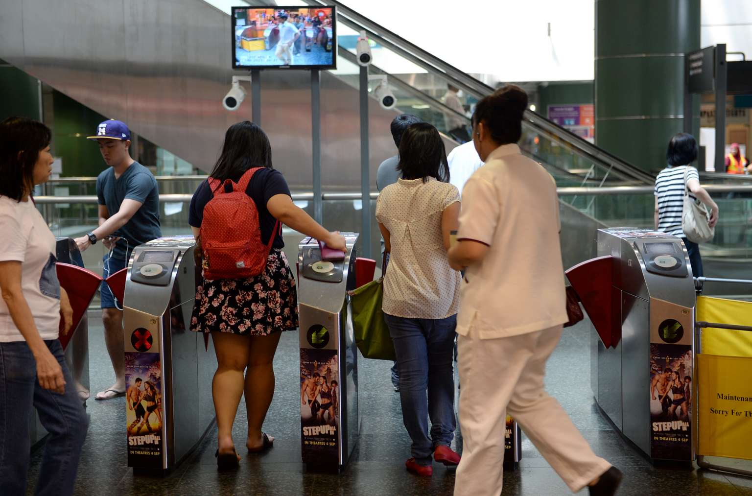 Commuters crossing the gantries at Seng Kang MRT station.