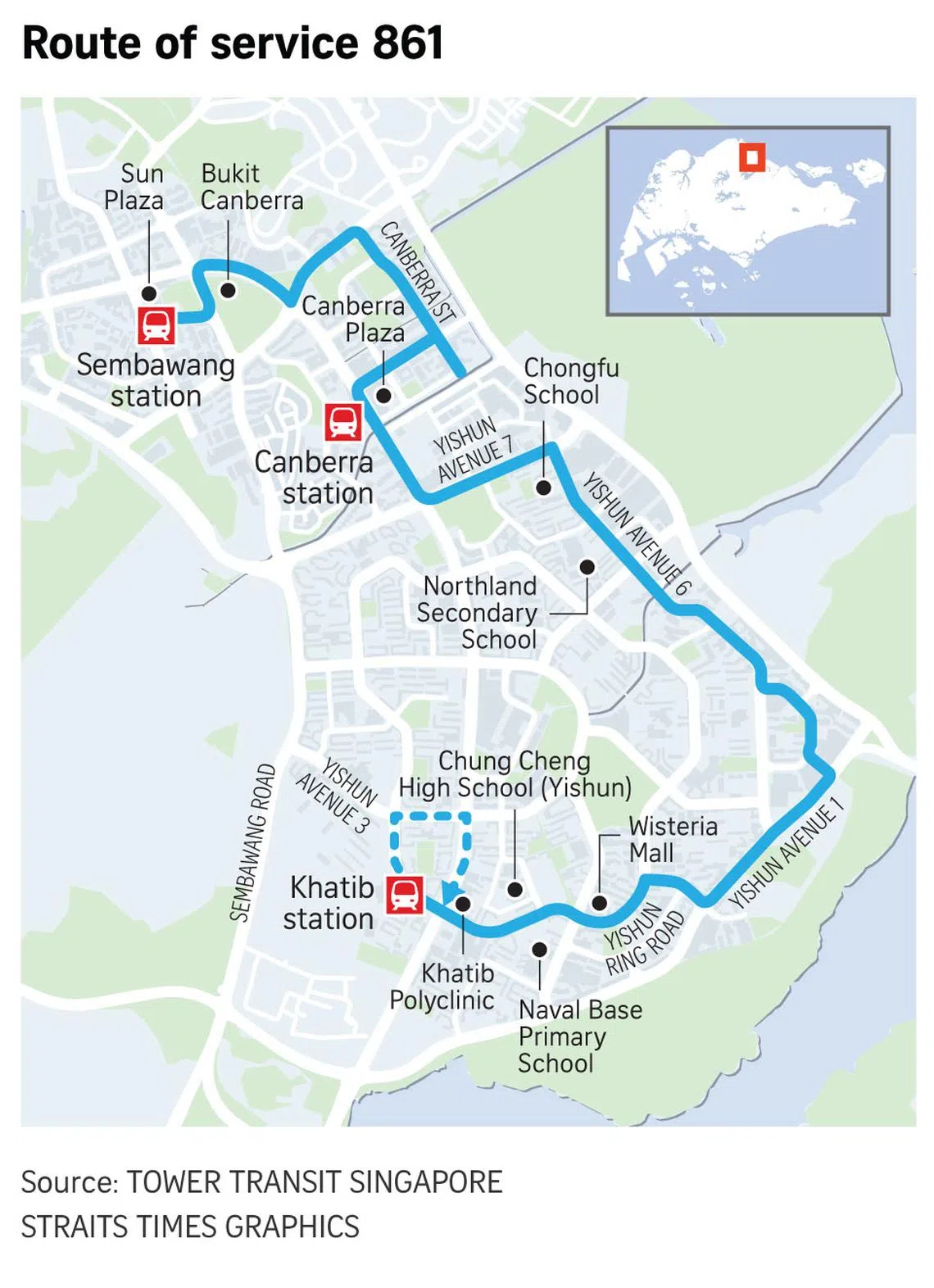 Service 861 will be run by bus operator Tower Transit Singapore. The service will operate between Sembawang Bus Interchange, Canberra MRT station and Khatib MRT station, according to Tower Transit Singapore.